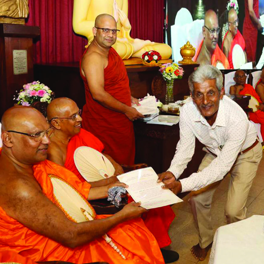 ඒ අනුව ලක්ෂ 15 බැගින් වූ වටිනාකමක් සහිත නිවාස 24ක් සාදා දෙන්න තීරණය කළා. දැනටමත් ඒ සඳහා මේ මේ සභාවේ සිටින පිංවත් සුසිල්වත් දානපතීන් 24 දෙනෙක් ඉදිරිපත් වෙලා ඉන්නවා. දැනටමත් ඒ සදහා අපේ වාස්තු විද්යාඥ මාධව ප්රේමරත්න මහතා මේ ගම්මානය හා නිවාස පිළිබද සැළසුම් හදාදී අවසන්. ඒ උත්තම පුණ්ය කටයුත්තට දායක වීම වෙනුවෙන් අද අපි අපේ අභිනව අනුනායක හිමියන්ගේ පින්වත් දෑතින් එම උතුම් පින්කම නිහඬව සිදුකරන පරිත්යාගශීලීන් වෙත ස්තුති පත්රයක් සහිත සමරු තිළිණයක් ප්රදානය කරනවා...”